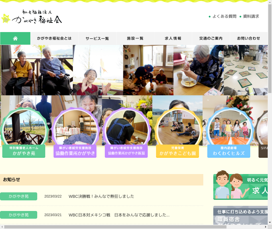 | 事業内容 | 特別養護老人ホーム、保育事業、児童発達支援事業、障がい者就労支援事業、室内遊戯場の運営を行っています。 |