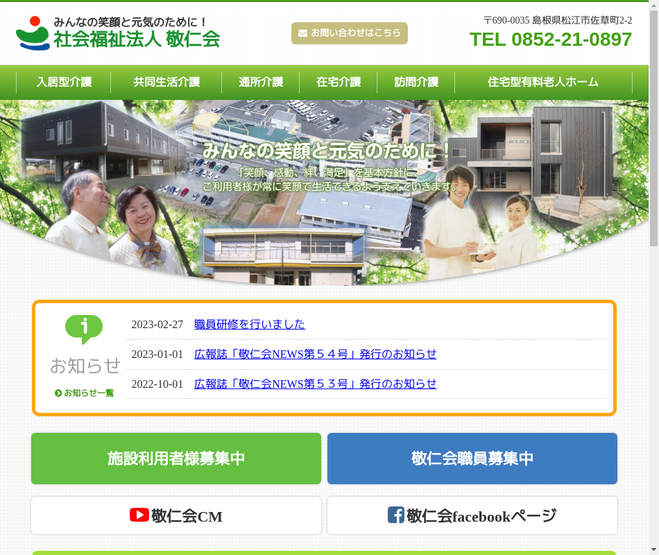 | 事業内容 | 出雲市大社町を中心に29年来、社会福祉法人として地域のニーズに応じた事業展開を行い、現在は特養、デイ、訪問入浴、居宅介護支援、訪問看護、グループホームを運営しています。 |