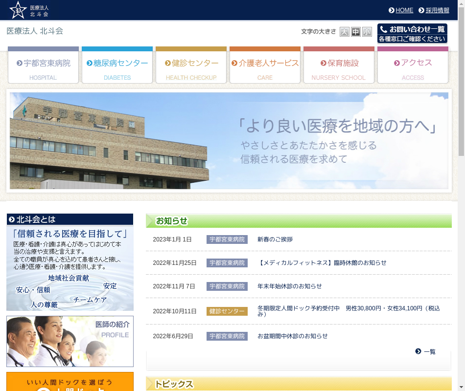 | 事業内容 | 内科・皮フ科・人間ドック・巡回健診。08年より糖尿病センター・健診センターを展開。事業拡充につき専門スタッフ募集中。https://www.hokutokai.or.jp/ |