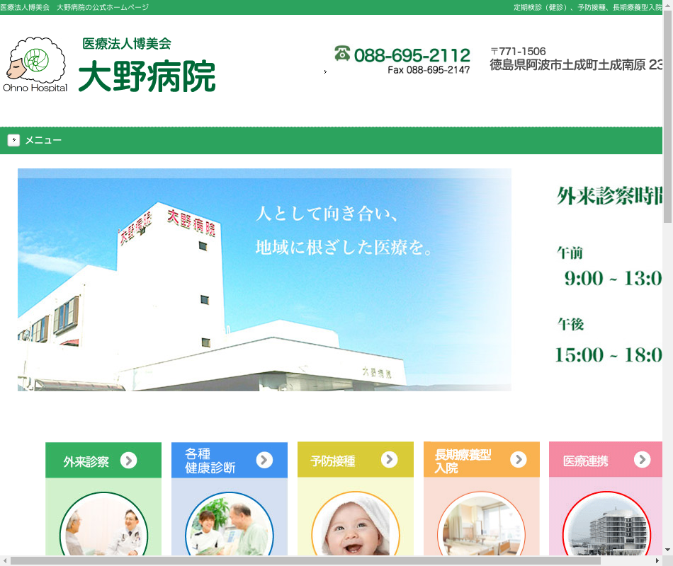 | 事業内容 | 病院、土成在宅介護支援事業所、病児保育室『こもれび』外来では内科・整形外科・小児科・健診等の診療を行っています。 |