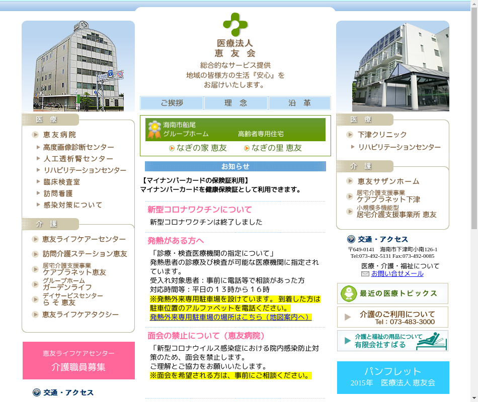 昭和61 年、海南市に恵友病院(一般病床50 床)を開設後、平成2 年には旧下津町に診療所及び介護老人保健施設 をオープン。また平成23 年にはグループホーム及び高専賃の新規開設、平成28年デイサービスセンターらそ恵友、海南・海草在宅医療サポートセンター開設など、医療から介護・福祉まで幅広いサービスを提供し、地域の皆様に貢献できる法人を目指しています。