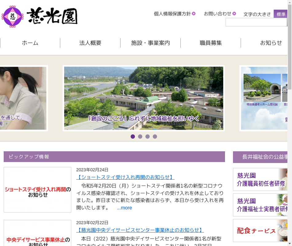 介護老人福祉施設 短期入所生活介護事業 通所介通事業 訪問入浴介護事業 居宅介護支援事業 訪問介護事業 軽費老人ホーム 特定施設入居者介護事業 介護職員初任者研修事業(公益事業) 介護福祉士実務者養成研修事業(公益事業) 地域高齢者等配食サービス事業(公益事業)