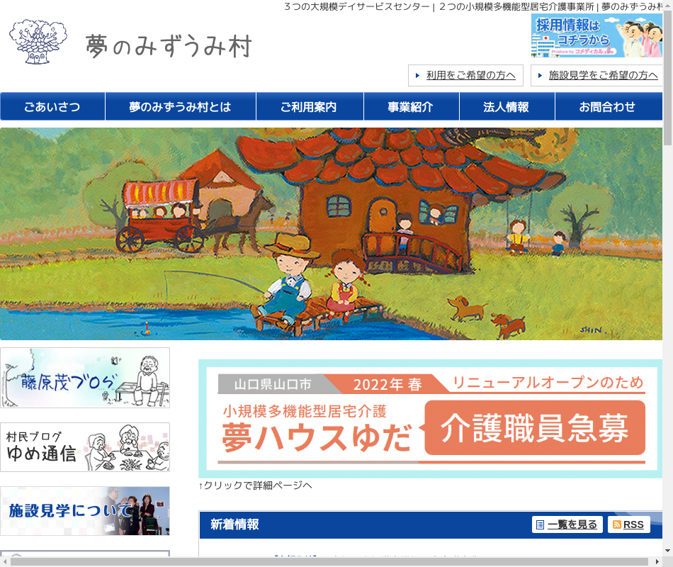 | 事業内容 | 山口県山口市内にデイサービス・防府市内にデイサービスと小規模多機能型居宅介護施設・東京都世田谷区にデイサービスと都市型軽費老人ホームを運営しています。 |