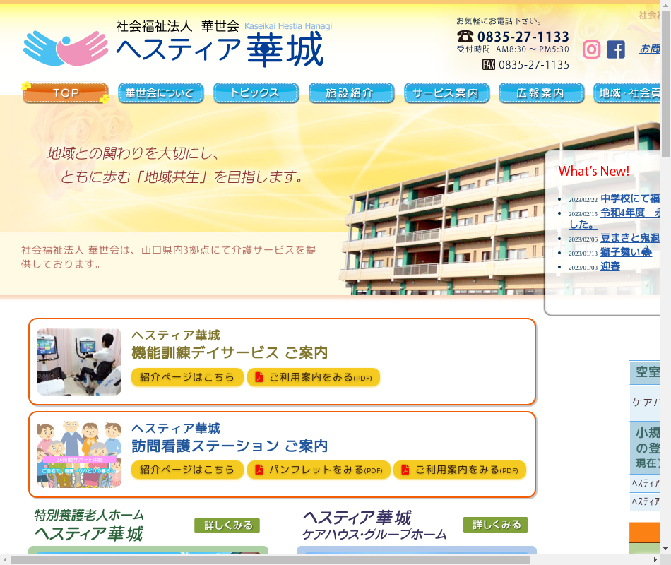 | 事業内容 | 特別養護老人ホーム、ショートステイ、デイサービス、ホームヘルプサービス、配食サービス、在宅介護支援センター、居宅介護支援事業所、ケアハウス、グループホーム、訪問看護ステーション |