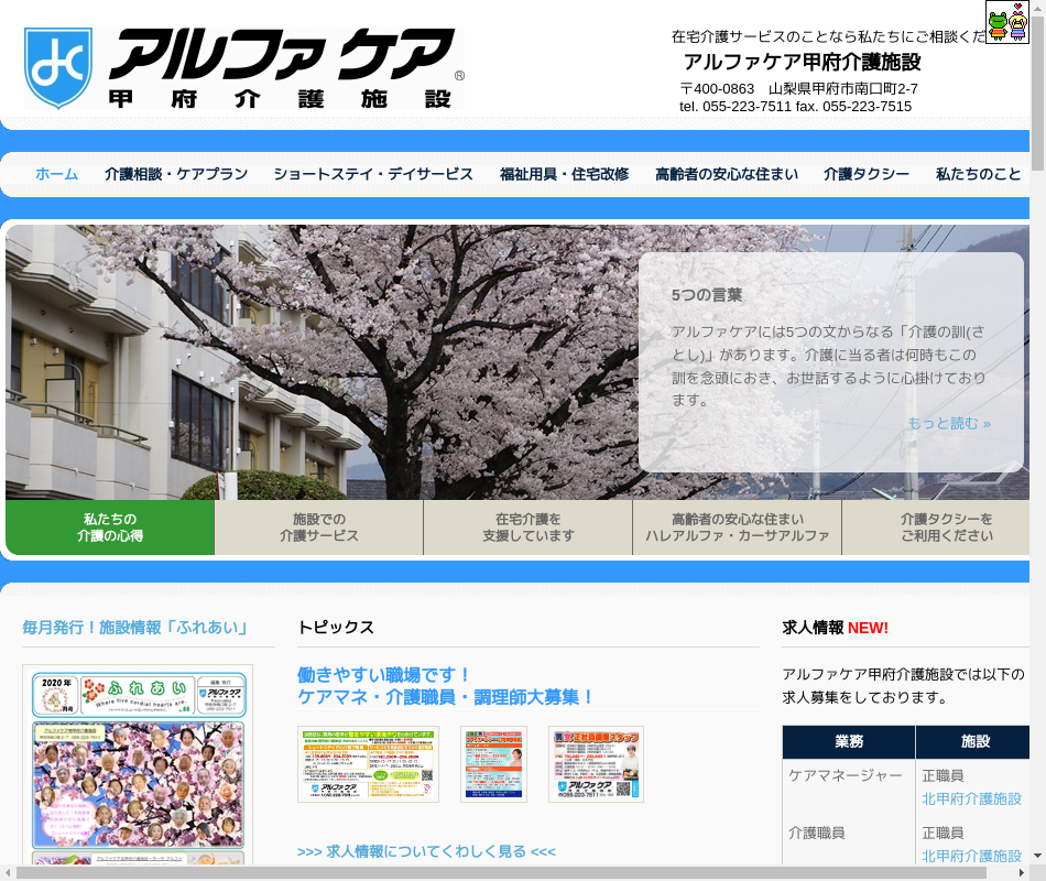 | 事業内容 | 南アルプス市から事業主として選定された介護施設[地域密着型共同生活介護認知症対応型のグループホーム(2ユニット18名)]です。平成26年3月に開所しました。 |