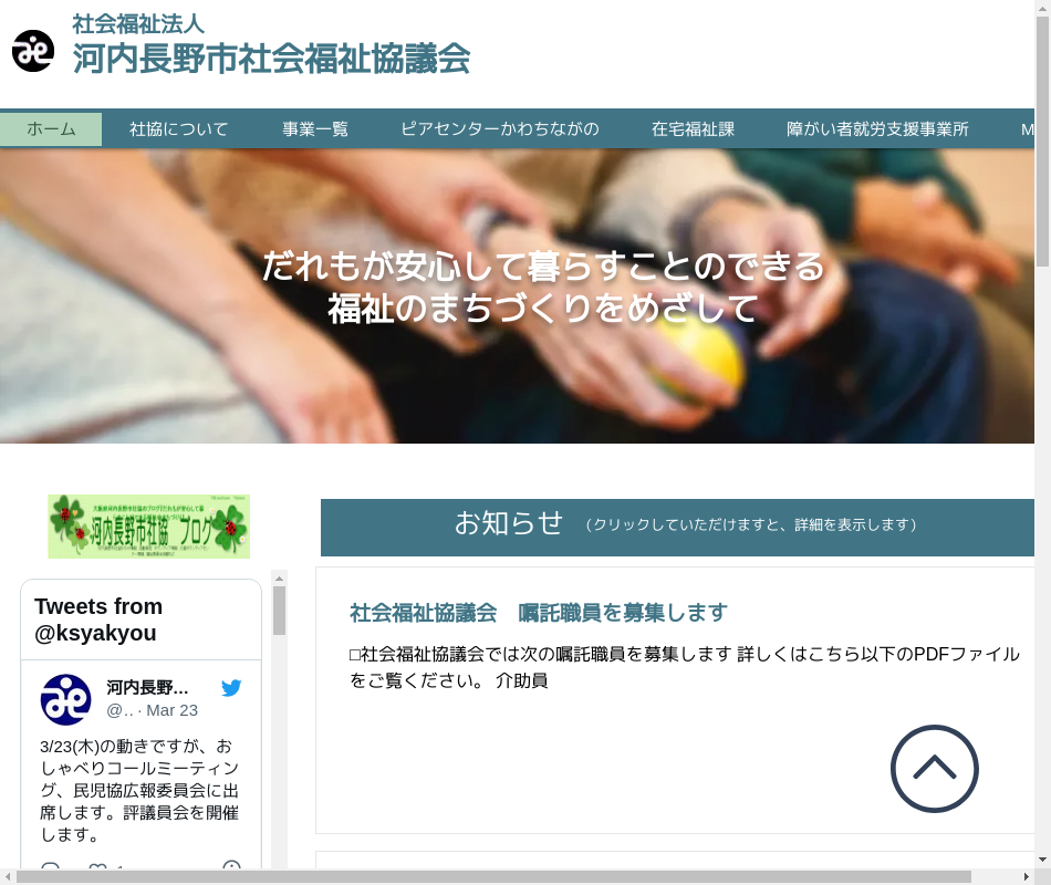 | 事業内容 | 地域福祉の推進及び福祉センター、障がい者福祉センターの運営など河内長野市から委託された事業に取り組んでいます。 |