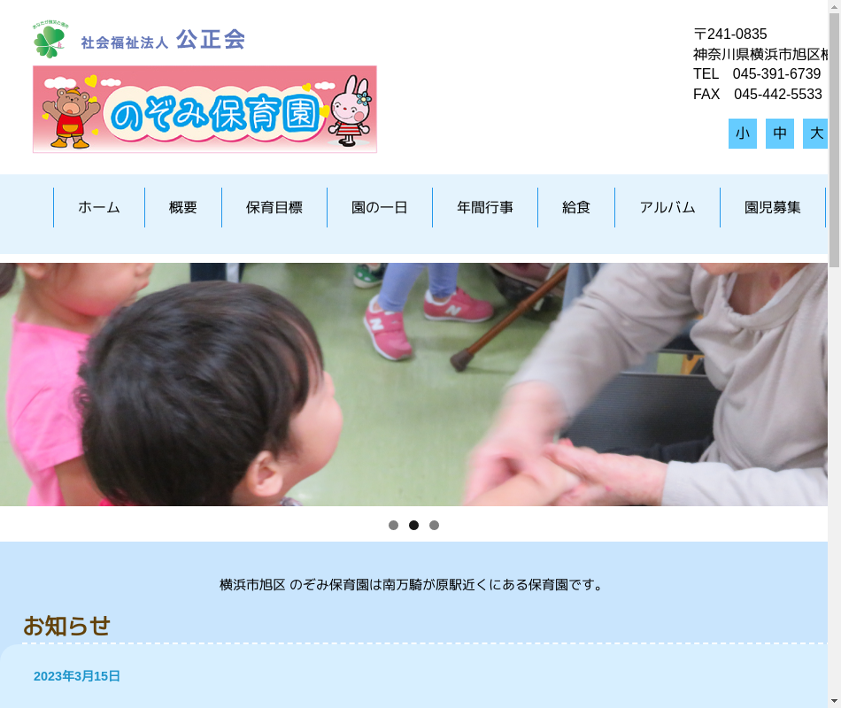 | 事業内容 | 特別養護老人ホーム「希望苑」、ショートステイ、デイサービス、居宅介護支援、上飯田地域ケアプラザ、横浜市認可「のぞみ保育園」を運営する。 |