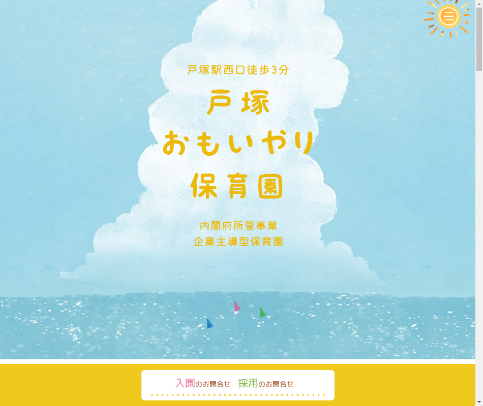 | 事業内容 | 戸塚おもいやり保育園です。当園は0歳児から2歳児をお預かりする定員19名、内閣府所管事業の企業主導型保育園です。認可保育園並みの基準をクリアし、内閣府より助成を受けながら運営します |
