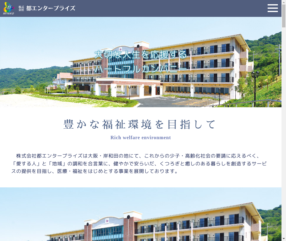 | 事業内容 | 介護保険事業・医療福祉コンサルタント・ホテル経営・ビル管理介護:2776300184(みやこ堺)介護:2774502153(みやこ泉佐野) |