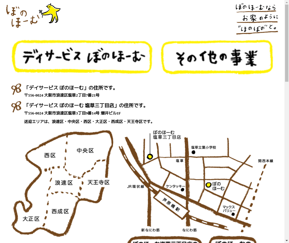 事業内容 | 浪速区・西成区・大正区・中央区・西区の利用者様を対象としたデイサービス等の介護事業。 |
