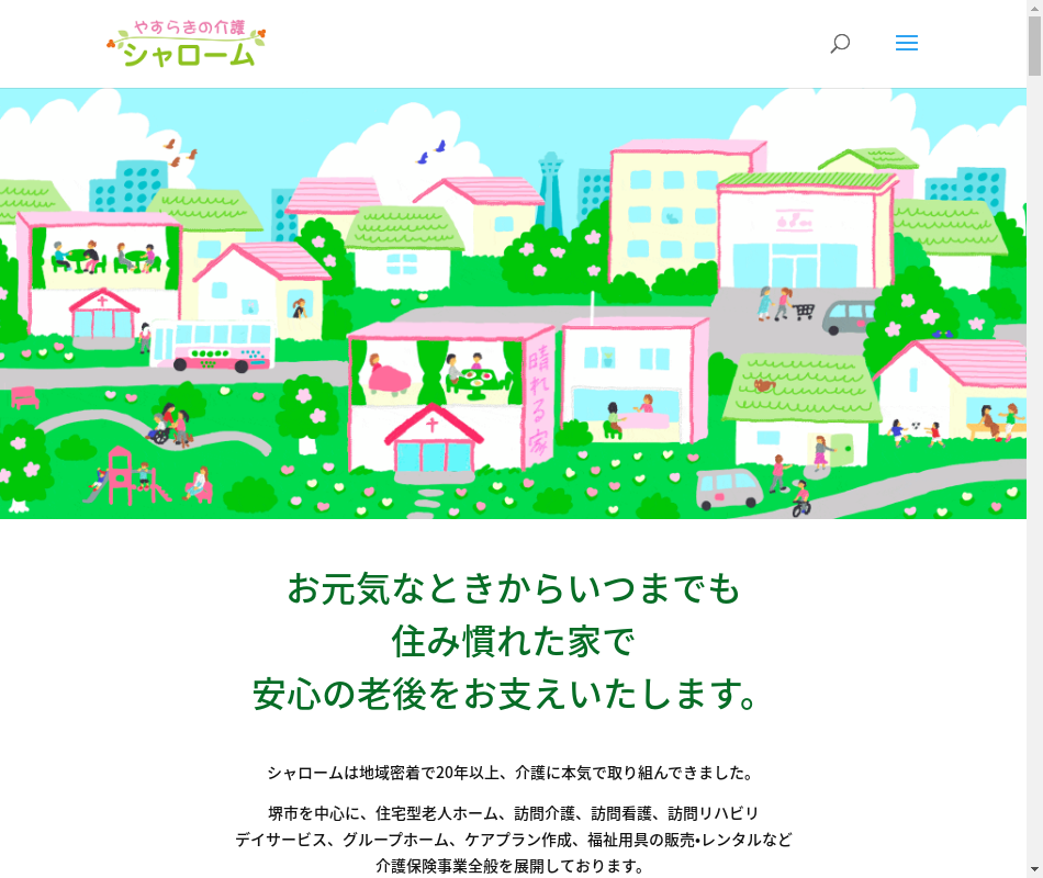 事業内容 | 通所介護、訪問介護、居宅介護支援、訪問看護、リハビリ、住宅改修、福祉用具貸与の在宅介護サービス全般と最近ではグループホーム、住宅型有料老人ホーム等施設サービスも展開しています |
