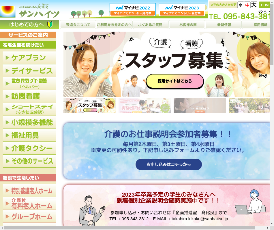 | 事業内容 | 社会福祉事業:特別養護老人ホームサンハイツ、ショートステイ、デイサービス、訪問介護、グループホーム、居宅介護支援、ケアハウス、配食サービス、包括支援センター |