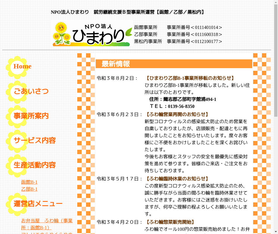 | 事業内容 | ・相談支援事業 ・地域生活支援事業(七飯町補助、森町委託)・就労支援事業(就労継続支援B型) ・生活介護事業・共同生活援助事業 ・空床型短期入所事業 |