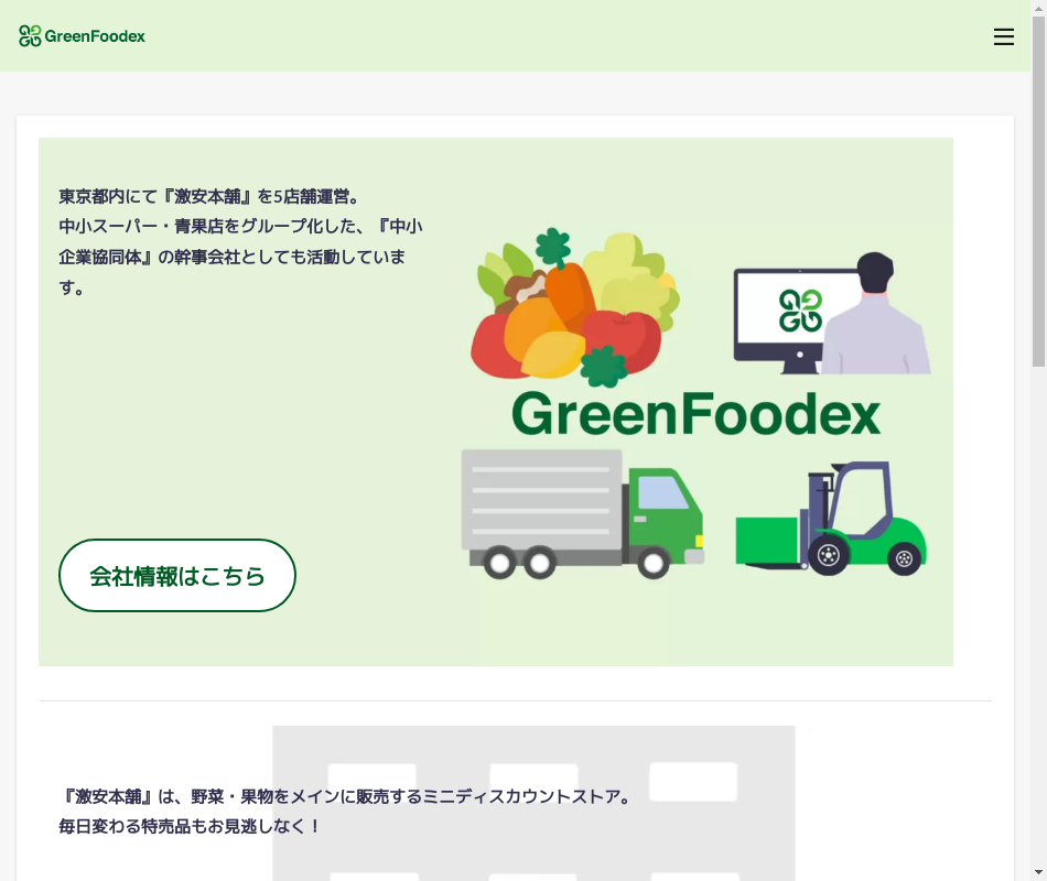 | 事業内容 | 青果を中心に食品を取り扱う、小型ディスカウントショップ経営。食品販売店40社以上(年商計110億円以上)をグループ化し、弊社でスポット商品を一括購入後各社に分配しています。 |