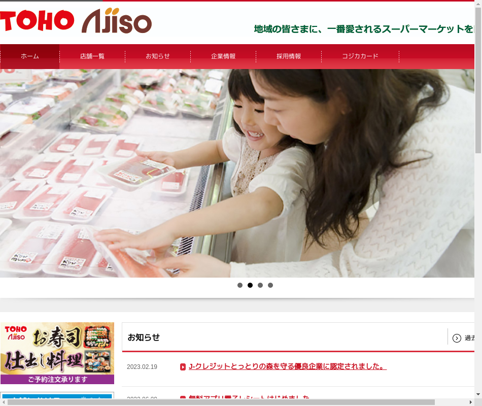 | 事業内容 | 生鮮食料品(鮮魚、精肉、青果、惣菜)に重点を置いた地域密着型のスーパーマーケットです。一宮市内に4店舗、清須市内に1店舗が有ります。 |