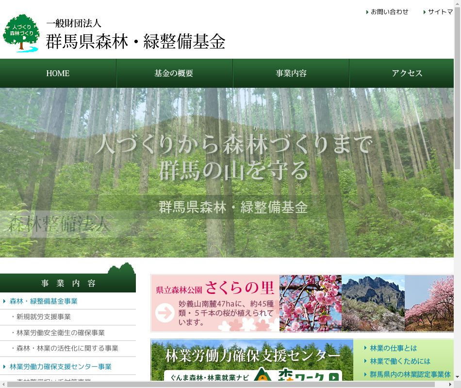 事業内容 | 当財団は、森林の整備及び林業労働カの安定確保や緑化推進を行うことにより、森林及び林業の活性化を図り、もって県民福祉の向上に寄与することを目的として設立され、次の事業を行っています。 |