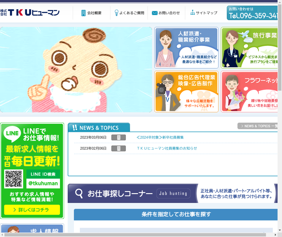 | 事業内容 | 一般労働者派遣事業(派43-010034) 有料職業紹介事業 (43-ユ-300031)大学生就活サイト及び合同会社説明会の開催、広告代理店、各種イベント開催、テレビ番組制作等 |
