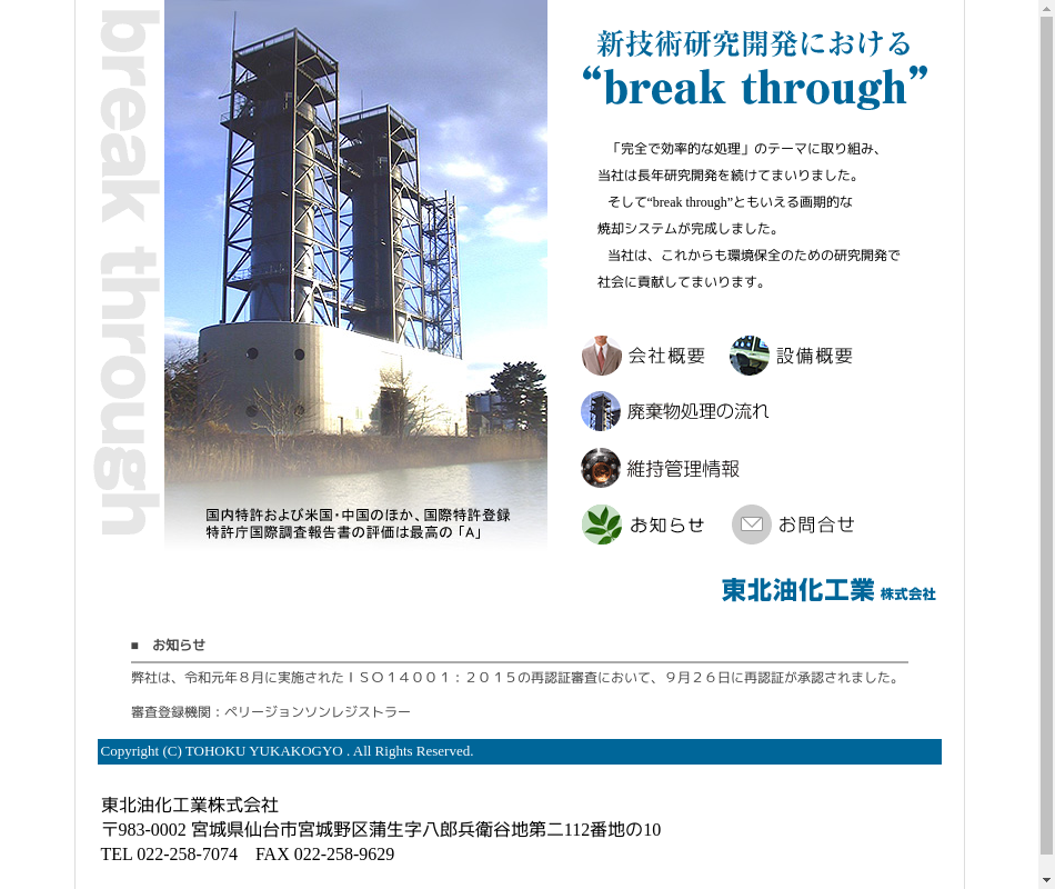 | 事業内容 | 新技術研究開発。産業廃棄物の中間処理(焼却・廃水処理)。油タンクの清掃・気密検査。廃油のリサイクル・再生重油精製販売。 |