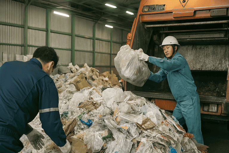 市の委託清掃業と民間業社のゴミ収集運搬業で各町内ステーション