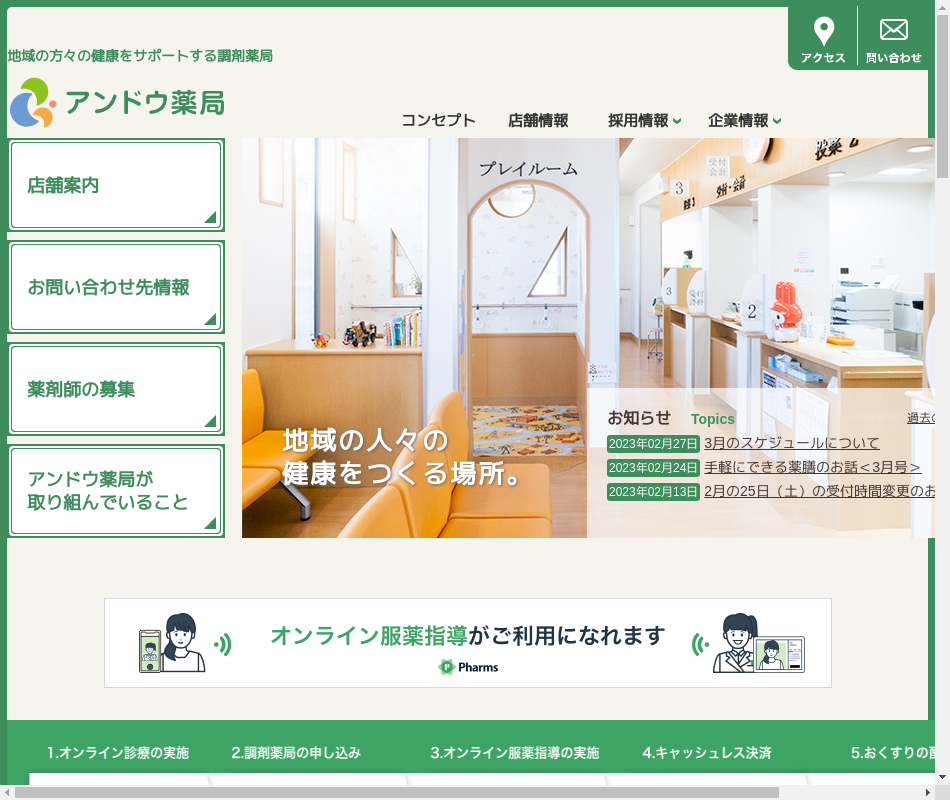 事業内容 | 主に小児科の処方せんを受け付ける保険調剤薬局です。また一般医薬品や健康食品の販売も行なっています。 |