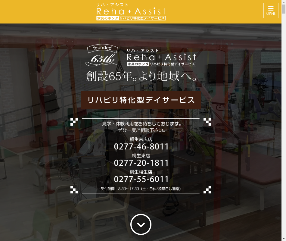 事業内容 | 『家具のホンダ』介護事業部が運営する、リハビリ特化の半日型通所介護サービスです。末広店、東店、相生店の3店舗があり、全利用者様への個別リハビリ、施設の広さ、豊富なマシンが特徴です。 |